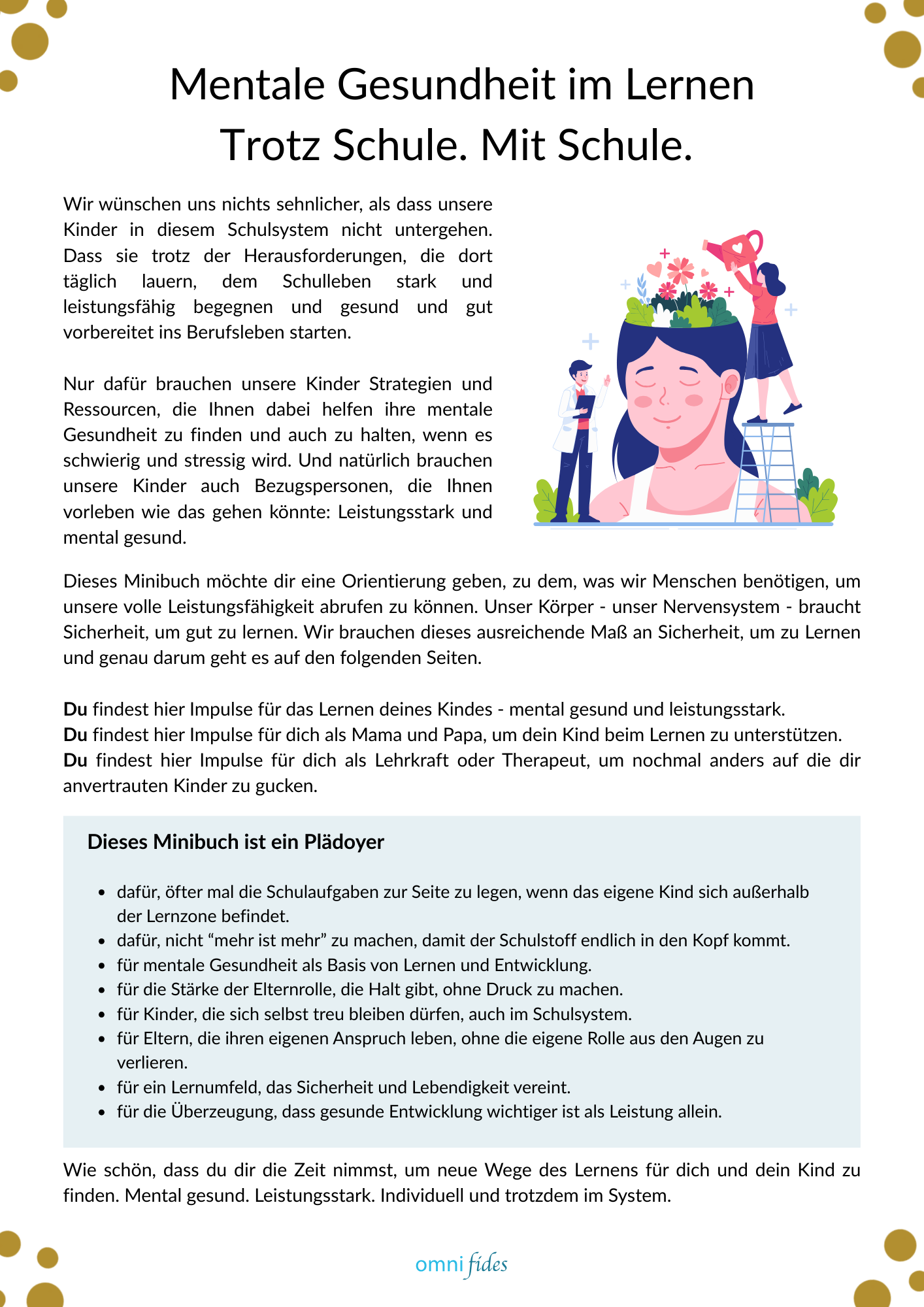 „Mental gesund trotz und mit dem (schulischen) Lernen!“ – Dieses Minibuch zeigt dir welche neurophysiologischen Grundlagen dein Kind zum Lernen braucht und was du tun kannst, um dein Kind bestmöglich zu unterstützen.